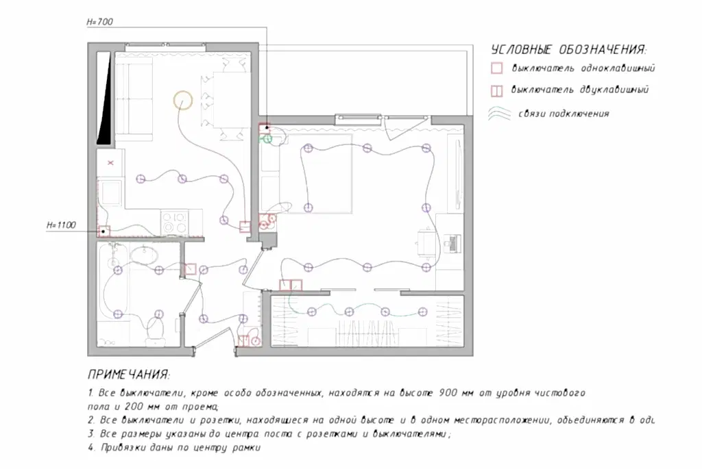 Планировочные решения в квартирах с указанием размеров, частичным или полным Pin Up стен, монтажом электрики и осветительных приборов, с размещением выключателей и розеток.